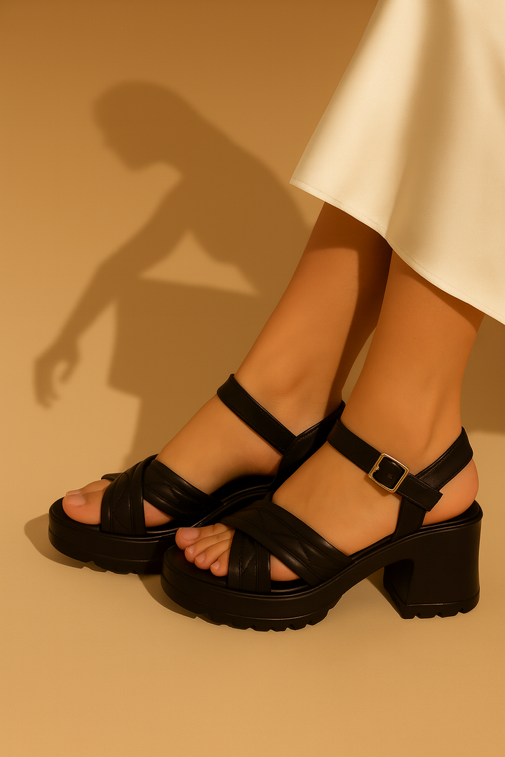 Crafted with plush, quilted straps and a bold block heel, Softies Noir brings together luxury comfort and timeless elegance. The smooth matte-black finish and cushioned sole make it perfect for both casual chic and evening polish. Designed for the modern woman who values style without compromise, these heels promise all-day ease with every confident step.