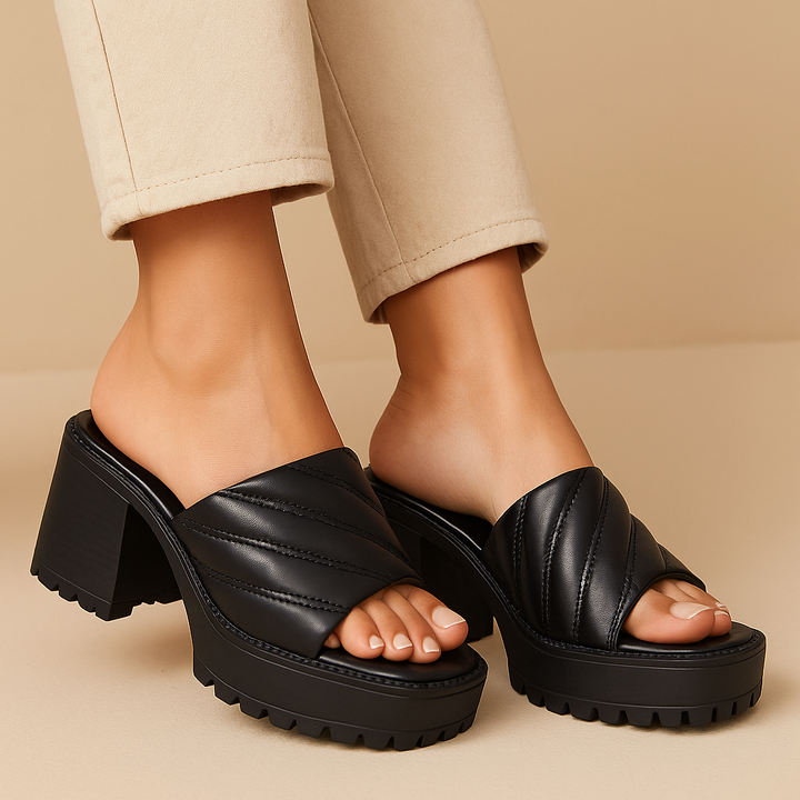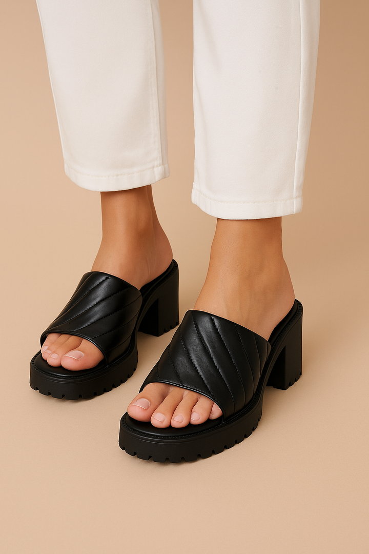 Crafted with plush, quilted straps and a bold block heel, Softies Noir brings together luxury comfort and timeless elegance. The smooth matte-black finish and cushioned sole make it perfect for both casual chic and evening polish. Designed for the modern woman who values style without compromise, these heels promise all-day ease with every confident step.