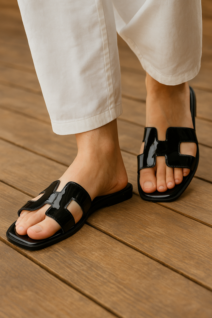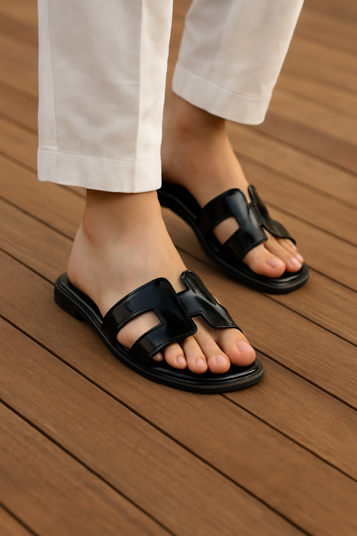 Glaze muse exude minimal luxury with their sleek, glossy finish and structured silhouette. The bold crimson tone adds a touch of sophistication, perfectly contrasted by the black sole outline. Their signature “H”-cut strap design blends modern geometry with timeless ease. Featuring a soft, cushioned base for comfort, they’re ideal for everyday elegance.