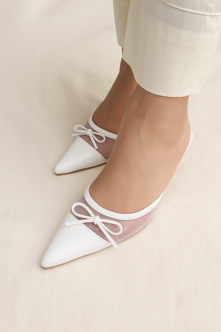 Elevate your ensemble with our bow net heels — where effortless style meets lasting comfort in every step.”